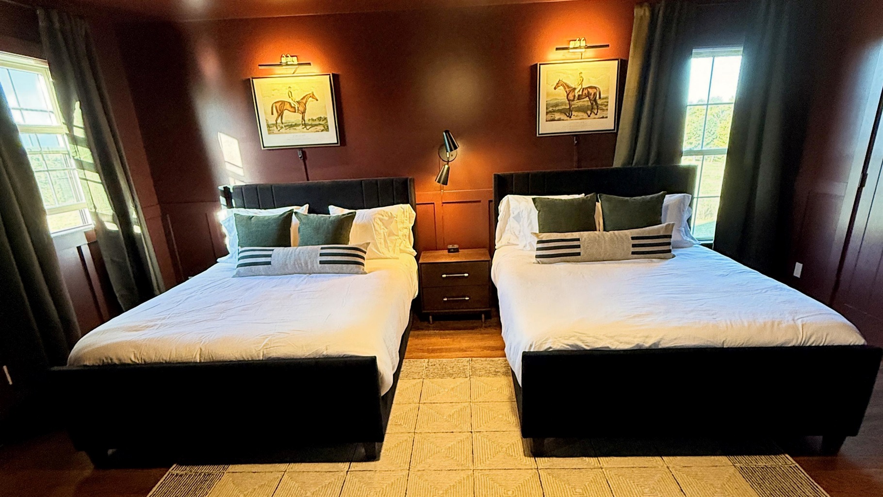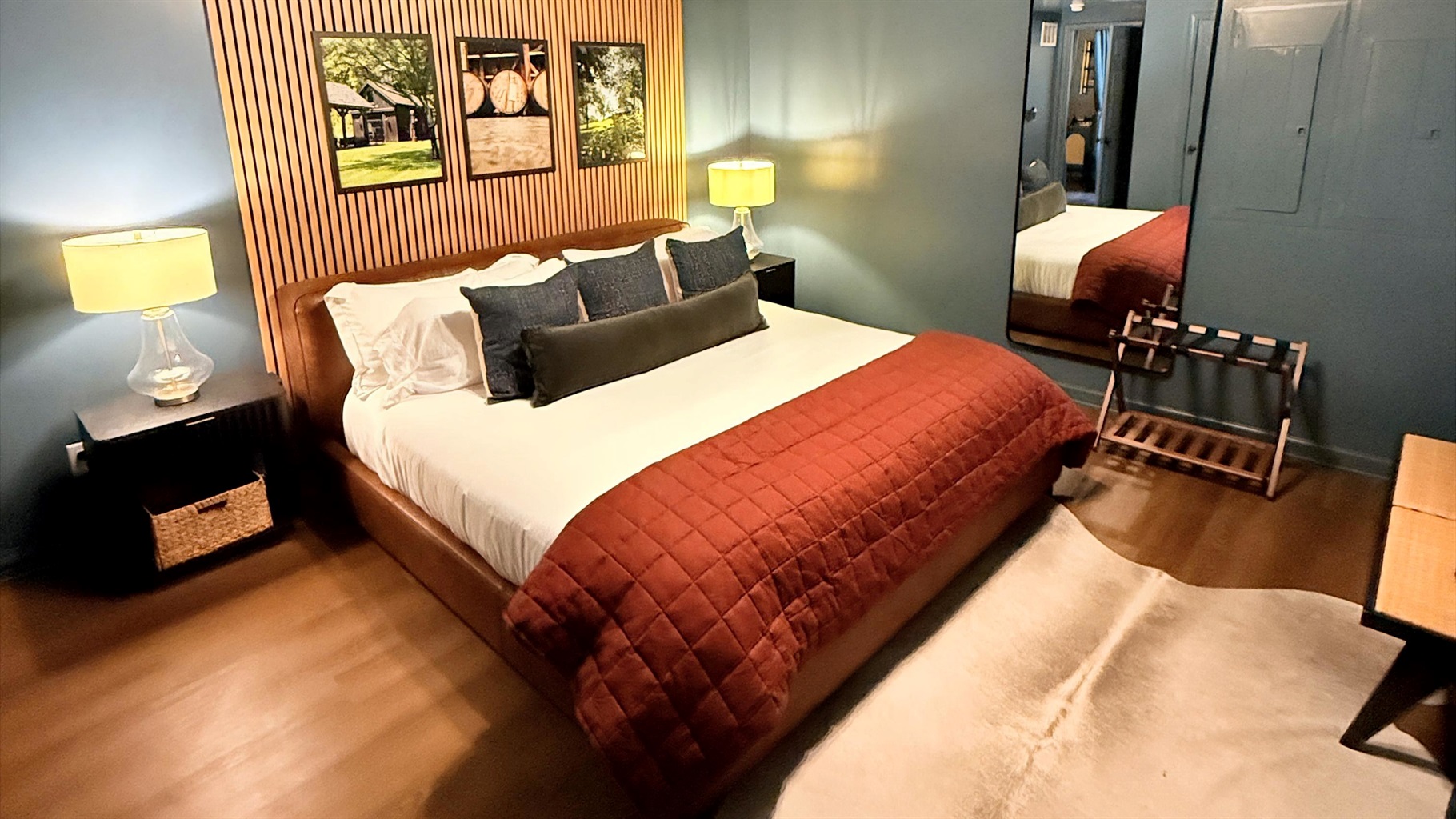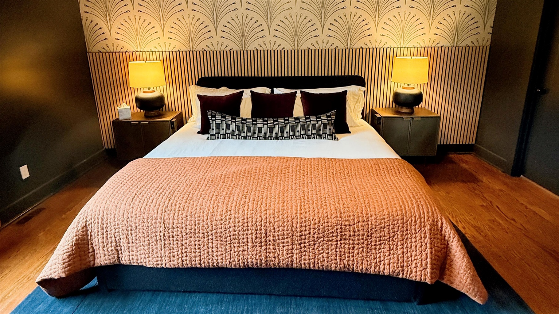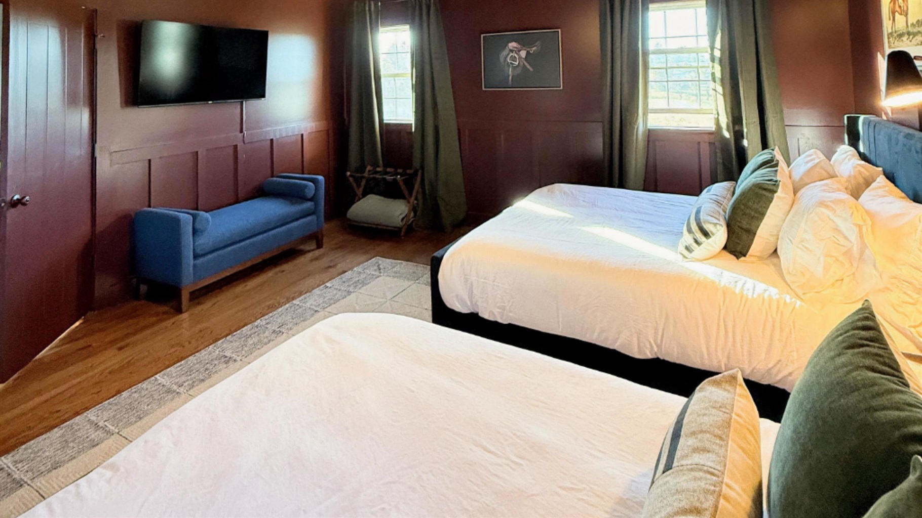 Five beautifully styled bedrooms â three king suites and two queen bedrooms â offer both comfort and personality across three levels. Each includes plush linens, curated art, and smart TVs, and several feature dedicated workspaces for guests balancing relaxation with productivity.